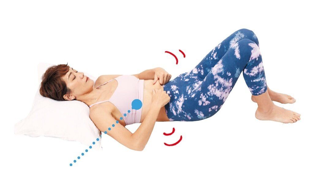 朝起きたとき仰向けで膝を立て、みぞおちの肉を両手でつまみ1分ぷるぷる揺らします。