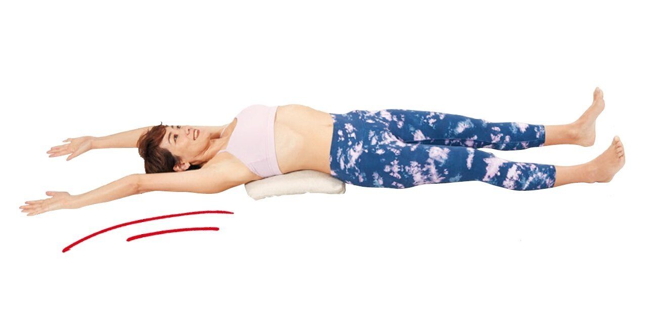 次に両手を頭の先に伸ばし、膝も伸ばし、お腹が伸びているのを感じながら10秒キープ。