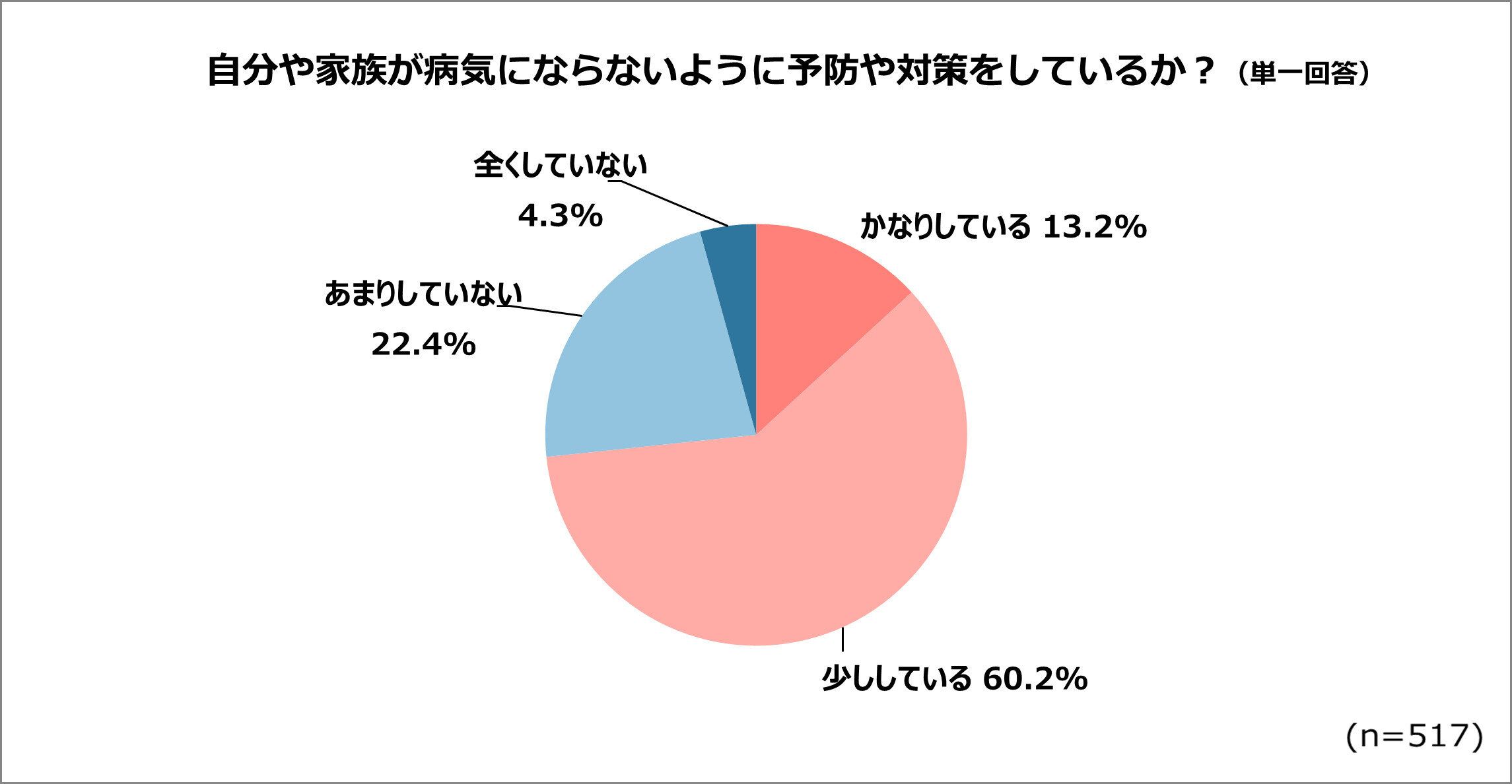 「まったくしていない」はわずか4.3%。「あまりしていない」を加えても26.7%。近年の共働きの急増により、自分や家族が病気になった場合のお金や時間などのリスクが大きいと考え、日頃から「病気になる前が大切」と、心がけているようです。