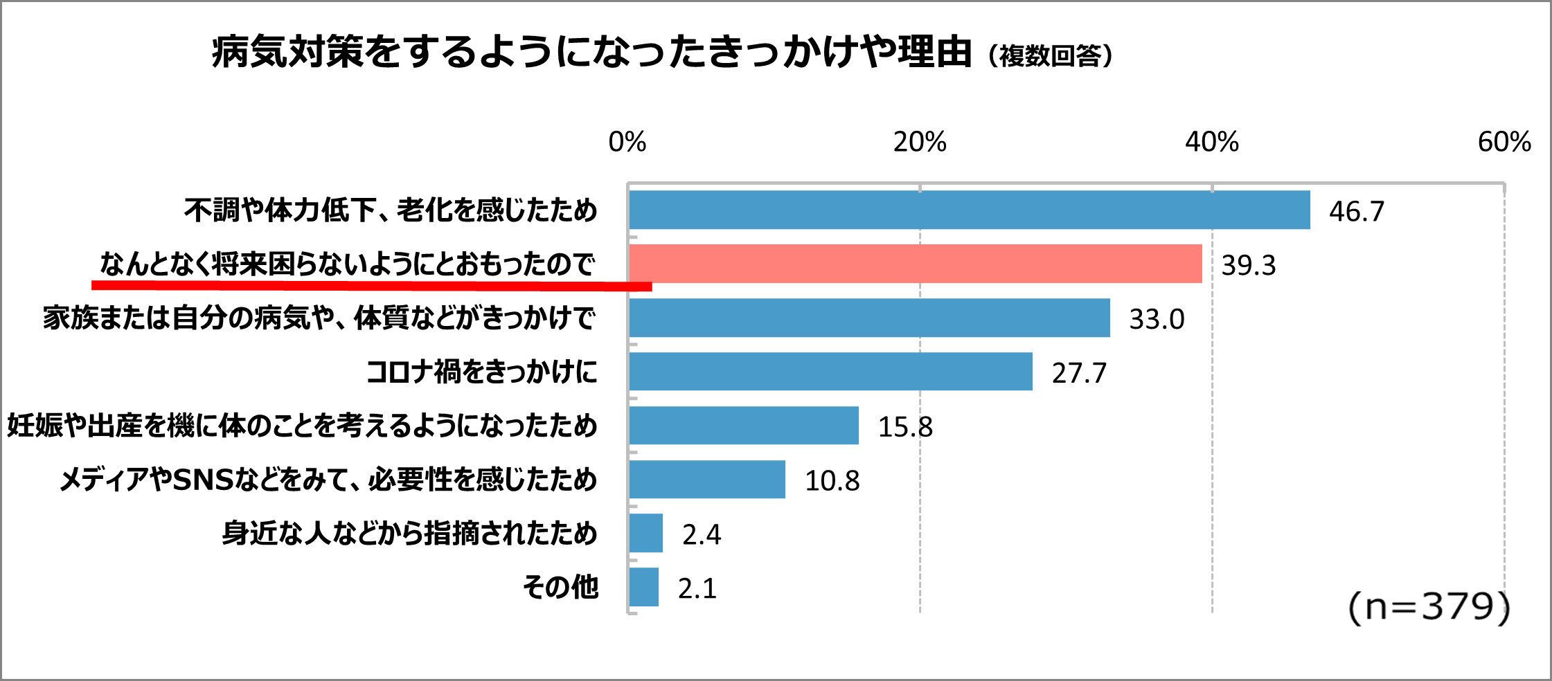 「病気対策をするようになったキッカケ」は「老化」に続いて「なんとなく将来が不安」