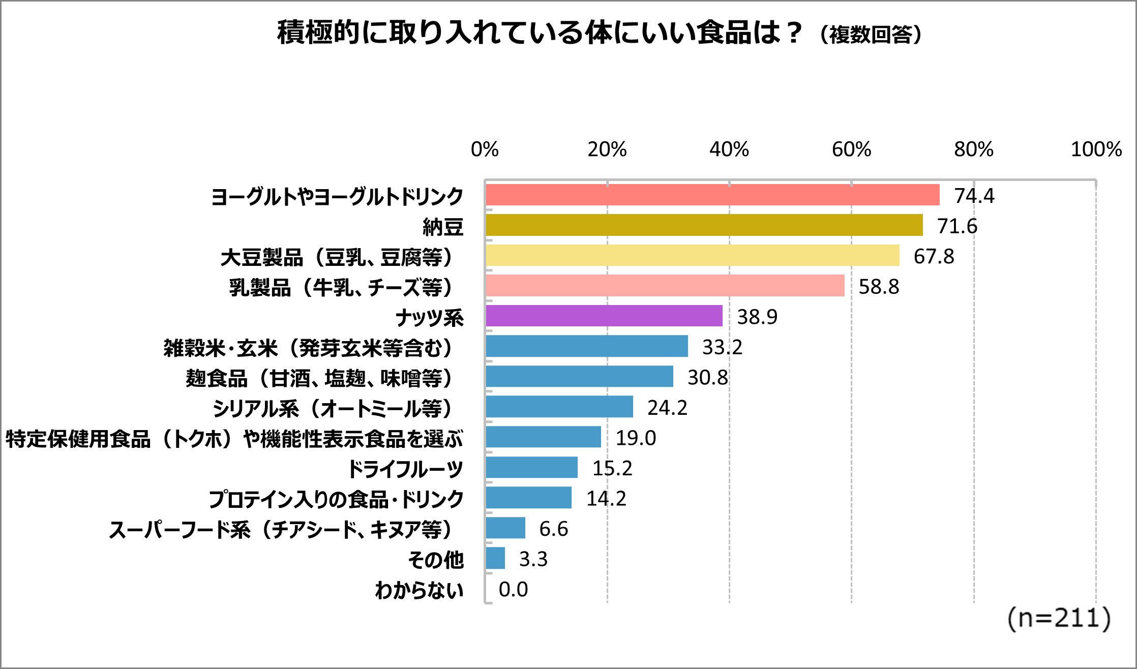 1位はヨーグルト、2位は納豆でした。ロカボブームの影響か大豆製品、ナッツ系も上位に入りました。日頃から、健康に関する情報収集を積極的に行っていることがわかります。