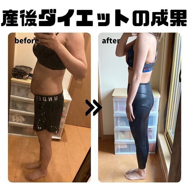 こちらがビフォーアフターの写真。-7kgの変化です。お腹まわりの変化に驚きですよね。二の腕や肩まわりもスリムに!子育てをしながらのダイエット、きっと大変だったのでは?ここまでの大きな変化を遂げたmai.happyaromalifeさんのダイエット方法を教えてもらいましょう。