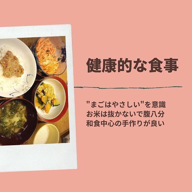 基本平日は和食が中心。ごはん、味噌汁、漬物にプラスして、「ま(豆類)ご(ごま)わ(わかめ・海藻類)や(野菜類)さ(魚)し(しいたけ・キノコ類)い(イモ類)」を取り入れることを意識した食生活になりました。無農薬野菜や無添加調味料などをつかいながら、がんばりすぎないオーガニックライフをめざしています。もちろん、子育て中のママですからがんばりすぎは禁物。つかれたときは、コンビニのダイエット食などではなく、ごはんとお味噌汁と納豆だけでいい、くらいの気持ちで続けています。