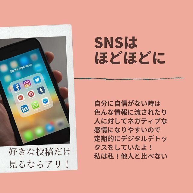 好きな投稿を見るだけならいいのですが、SNSを見すぎることは、いろんな情報に流されたり、ネガティブな感情になりやすいこともあり、定期的に距離を置くようにしているのだそう。「私は私!」と他人と比べないように心がけています。