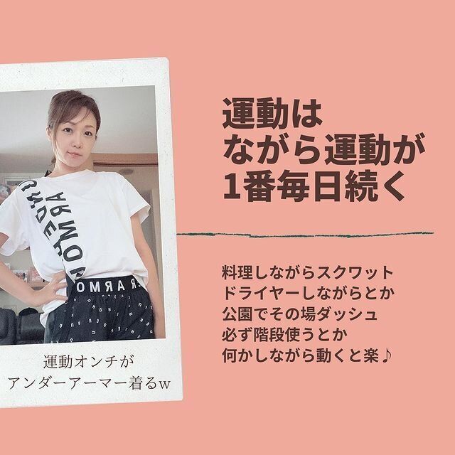 子育て真っ最中のママだから、「とにかく時間がない。子どもにトレーニングの邪魔をされる」という生活。現実としてトレーニング時間をしっかりととることはむずかしいですよね。そこで、ダンス動画を流して子どもと一緒にダンスをしたり、子どもがぐずったら抱っこをしながらスクワット。ドライヤーで髪を乾かしながら太もも上げ。部屋の片づけや雑巾がけだって、日々のトレーニングです。とにかく毎日やれることをコツコツと続けているといいます。
