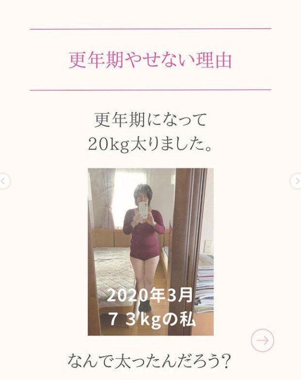 こちらが2020年3月の写真で、49歳のとき。若いころよりも20kgも太ってしまったのだそう。それは年齢を重ねたことによって代謝が下がり、筋肉量や女性ホルモンが減ってしまうことが原因だといいます。