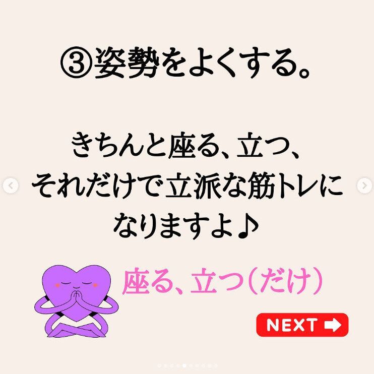 過去のダイエットでは、激しい運動を取り入れたところ、ケガをしてしまったのだそう。今回のダイエットでは、基本的には運動はしていません。ただ、姿勢を正して、きちんと座る、きちんと立つ。これだけでも立派な筋トレになるのだそうですよ!