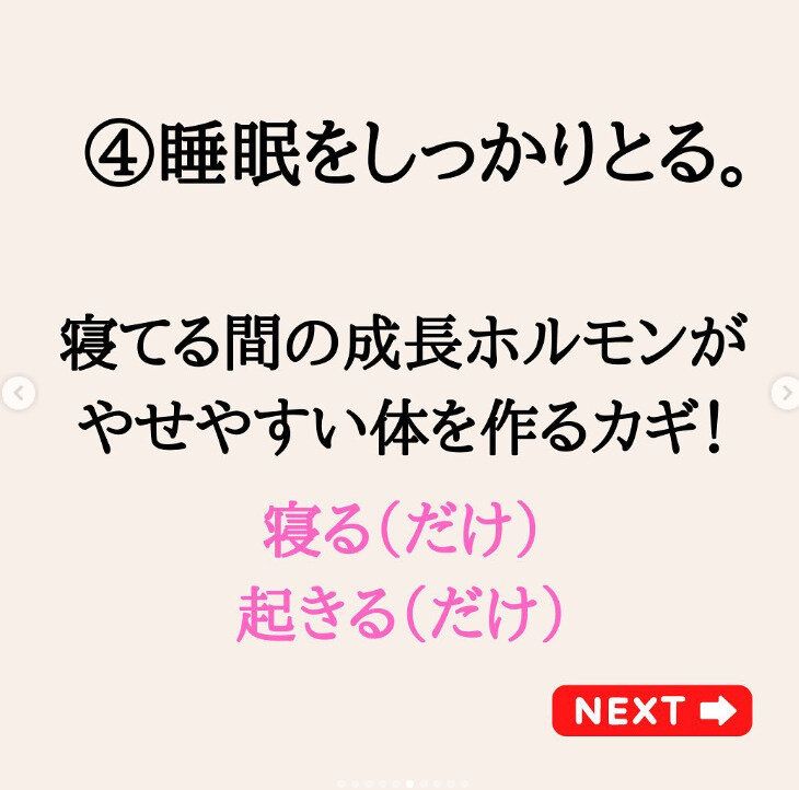 睡眠をしっかりととることを心がけるように。寝ているあいだに分泌される成長ホルモンが痩せやすい体をつくるカギだといいます。とくに、12時よりも早く寝るのがおすすめなのだそう。