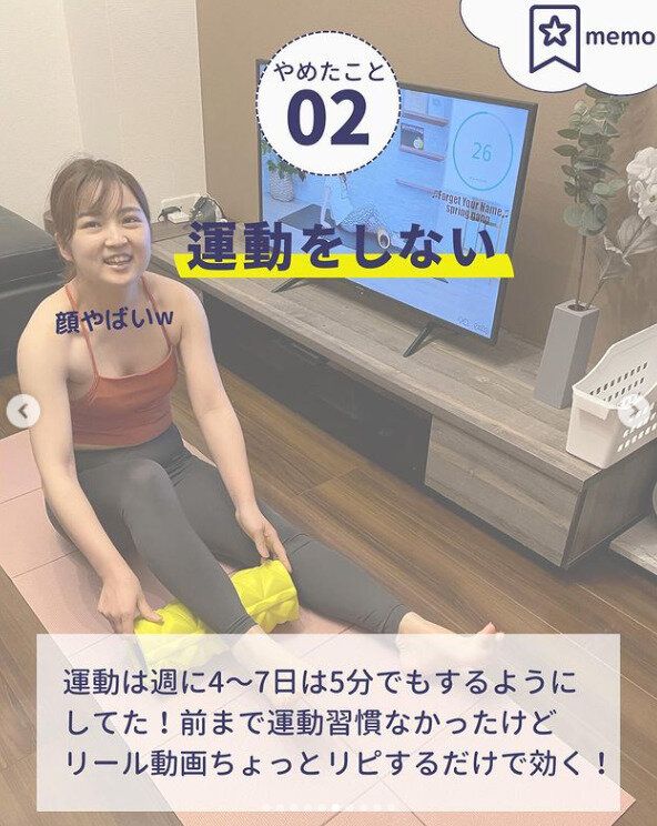 体を動かす習慣がなかったそうですが、週に4~7日は、たとえ5分でも体を動かすようになりました。体が変わる実感があったといいます。