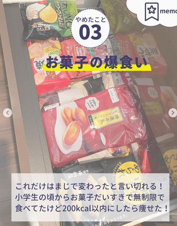 小さなころからお菓子が大好きで、無制限に食べてしまっていたことも。ダイエットを始めてからは、お菓子は200kcal以内と自分でルールを決め心がけました。