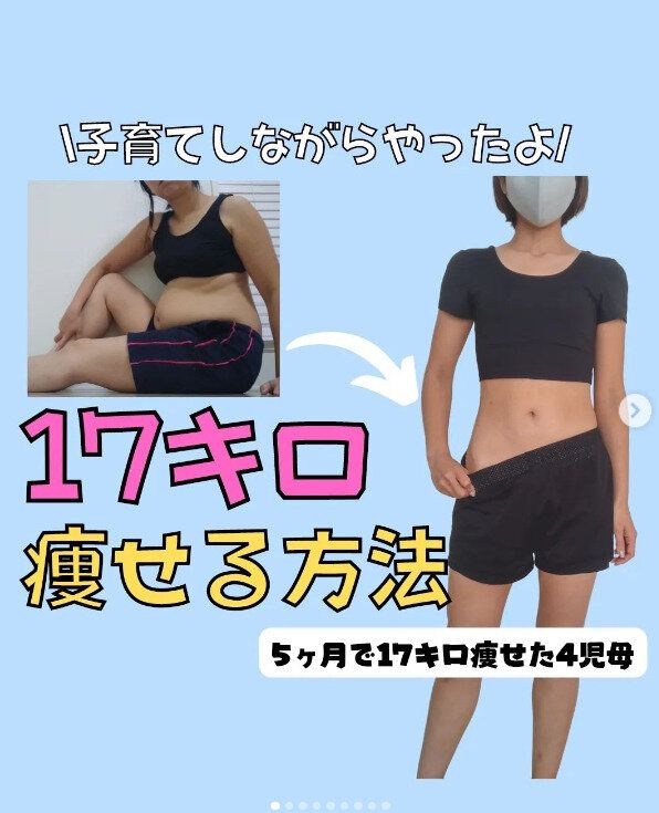 生活習慣を改善し、5カ月で17kg痩せた姿がこちら。まさに「別人級」のダイエットです。健康的で、姿勢も美しく、ボディラインもとってもきれい!4人の子どもを育てながら、5カ月でここまで変われることに驚きです。