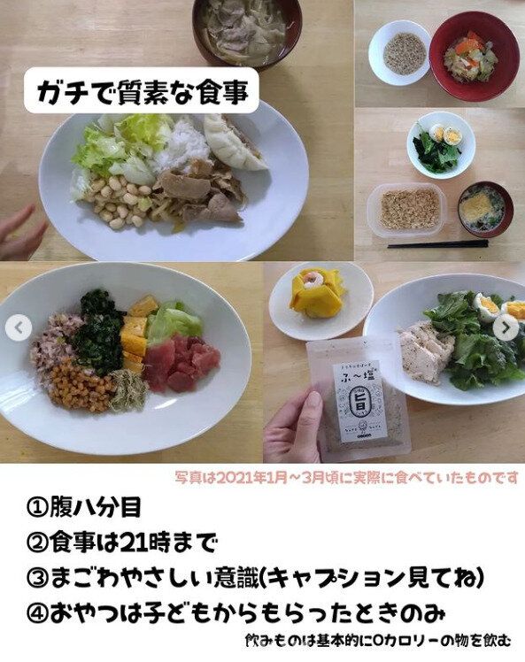 ご本人いわく、「質素な食事」といいますが、日々の食生活は「ま(豆類)ご(ごま)わ(わかめ・海藻類)や(野菜類)さ(魚)し(しいたけ・キノコ類)い(イモ類)」を意識したメニュー。「腹八分目」を心がけ、食事は21時まで。おやつは子どもからもらったときだけ、と自分ができる範囲でルールを決めました。