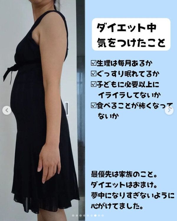 食生活の改善、体を動かす習慣を身につけたことで、体重は順調に減っていったといいます。ただし、気をつけていたことがあるといいます。「生理は毎月あるか」「ぐっすり眠れているか」「子どもに必要以上にイライラしていないか」「食べることが怖くなっていないか」といったこと。「最優先は家族のこと。ダイエットはおまけ。夢中になりすぎないように心がけていました」というdiet_naomamaさん。体と心への負担をかけないように客観的に見つめることも忘れませんでした。