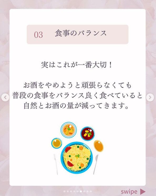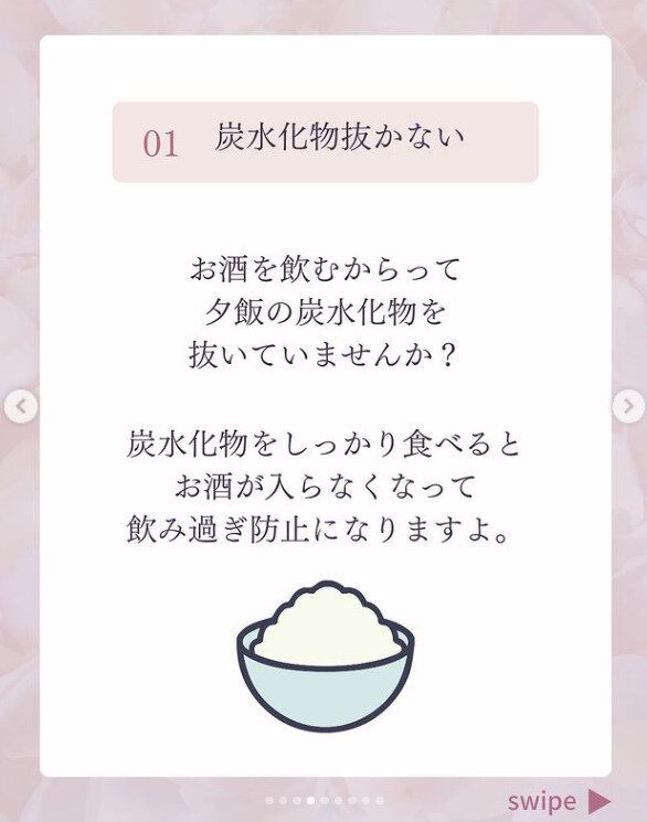 お酒を飲むからと、ごはんなどの炭水化物を抜いていませんか?とn.fujiwara.dietさんはいいます。炭水化物をきちんと食べれば、お酒が入らなくなって飲みすぎ防止にもつながるのだそう。