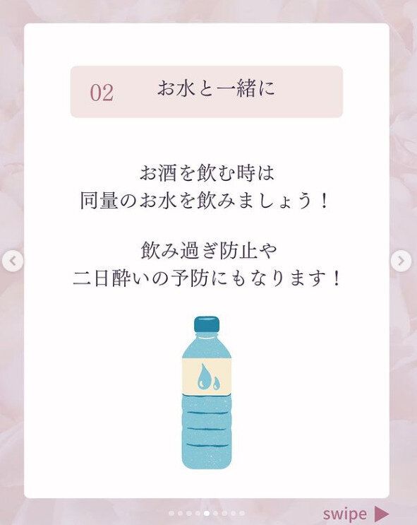 お酒を飲むときは同量のお水を飲むのがいいのだそう。飲みすぎ防止や、二日酔いの予防にもなるといいます。