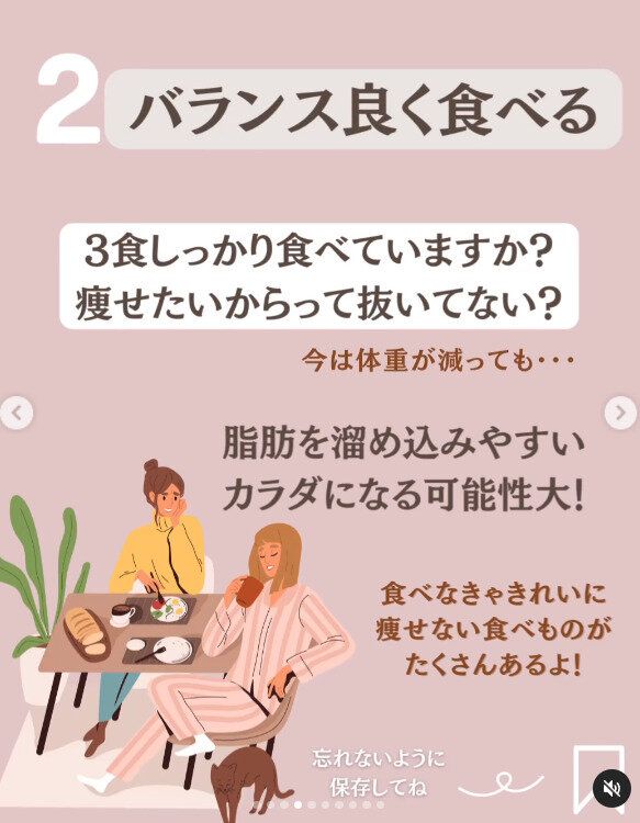 「40代以降は、急激に痩せると残念なくらい貧相にみえる」とmiyabi.diet164さんはいいます。短期間で痩せるとリバウンドをするのも早いのだそう。ダイエットは長い目で、一生コツコツと続けていけるものにすること。