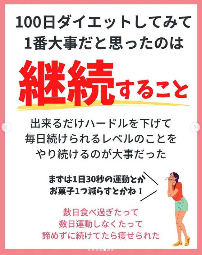「100日ダイエット」に成功したdiet_tenten2さん。ダイエットでいちばん大事と感じたことは「継続すること」だといいます。ご本人いわく「3日坊主」とのことですが、それでも100日にわたって続けることができた理由。それは、できるだけハードルを下げて、毎日、自分が続けられることを見つけたこと。まずは、1日30秒の運動をしてみる、まずはお菓子を1つ減らしてみるなど、できることから始めて習慣にしていくことが大切なのです。