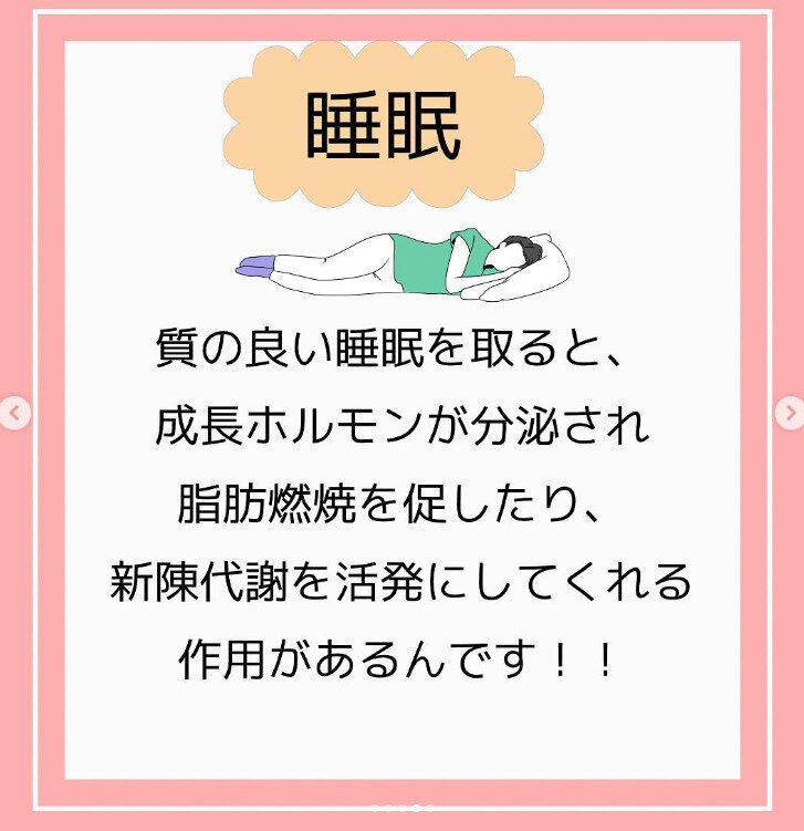ダイエット初心者さんにとっては、睡眠とダイエットに何の関係が?と思いますよね。じつは、質のよい睡眠をとると成長ホルモンが分泌され、脂肪燃焼を促したり、新陳代謝を活発にしてくれる作用があるのだそう!