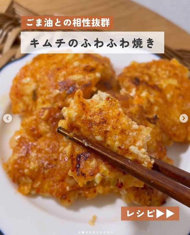 つくり方は簡単。キムチ50g程度と、木綿豆腐150g(水切り不要)、片栗粉大さじ2をよく混ぜて、小さじ1~2のごま油をしいたフライパンで弱火~中火で両面を焼くだけ。ふわふわの食感で、キムチとごま油との相性も抜群。タレがなくてもおいしいのだそうですよ!