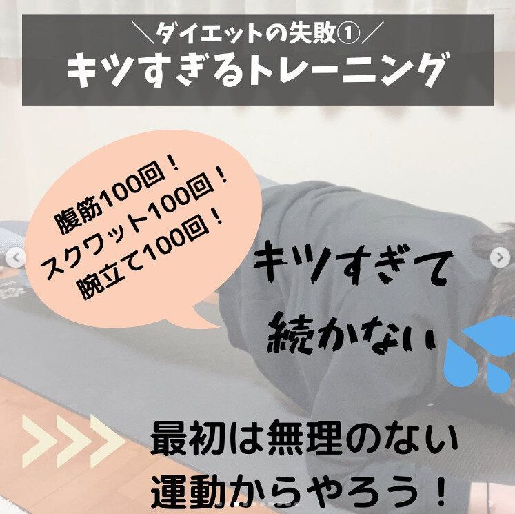 ダイエットをスタートしたときは、誰もが「がんばるぞ!」の思いにあふれているはず。erisangoyogaさんもそのひとり。「腹筋100回、スクワット100回」とがんばった結果、残念ながらきつすぎて続かなかったといいます。最初は無理のない運動から始めるのがおすすめなのだそう!