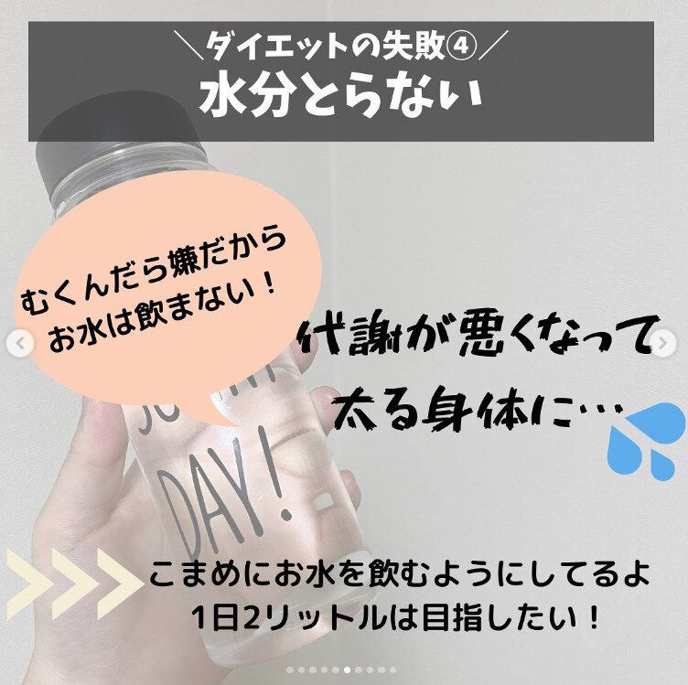 「むくむのが嫌だから」と水分をあまりとっていなかったのだそう。でも結果として代謝が悪くなり、太りやすい体に。今はこまめにお水を飲むように心がけています。