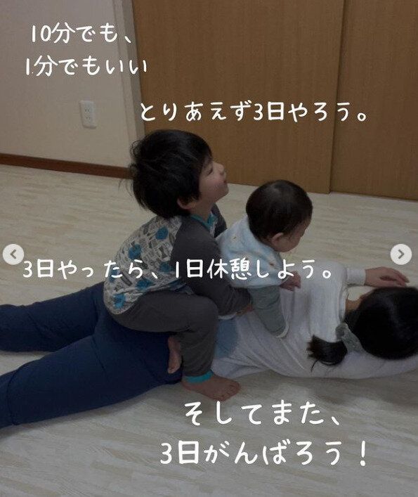 「3日坊主の性格」だと自身を分析するerisangoyogaさん。たくさんの失敗をしたからこそ気づいたこと。それは、きついトレーニングをして短期決戦で勝負をするのではなく、「10分でもいい、1分でもいい。とりあえず3日やろう。」ということでした。家事に育児に仕事にと大忙しの毎日ですが、少しの時間をみつけて自宅でのトレーニングをがんばってみたのです。「そして3日やったら1日休憩して、そしてまた3日がんばる」という方法にしたところ、無理なく継続することができるようになりました。