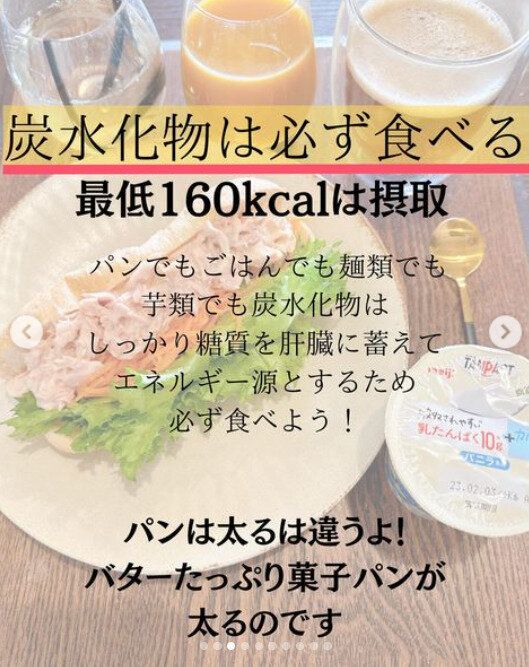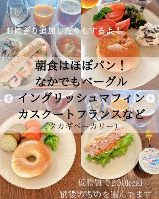 まずは朝食から。エネルギー源となる炭水化物を必ず食べているそう。パン、ごはん、麺類、芋類、なんでもいいので最低160kcalは食べようといいます。ダイエット中にパンは太ると我慢している人もいるのでは?「パンは太るというのは違います。バターたっぷりの菓子パンが太るのです」とhana.fula_dietさんはいいます。