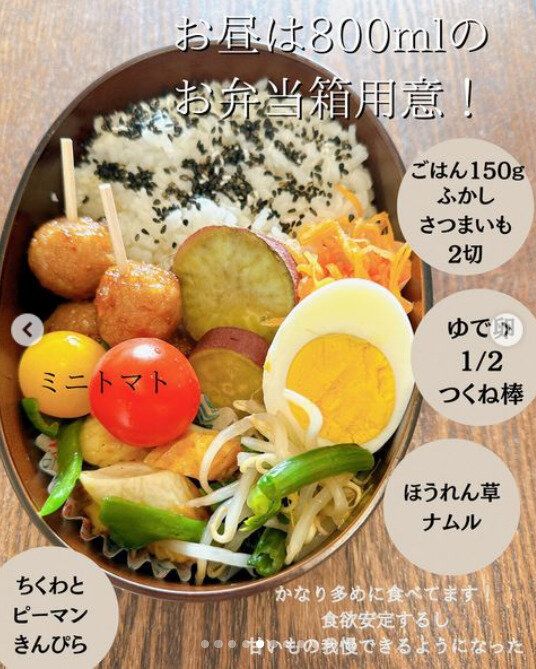 お昼は800mlのお弁当箱をつかって、彩りも豊かな多めのお弁当。野菜、ごはんや芋などの炭水化物、卵やつくねなどのタンパク質など、栄養バランスも考えられています。お昼はかなり多めに食べるそうで、「食欲も安定するし、甘いものを我慢できるようになった」のだそう。