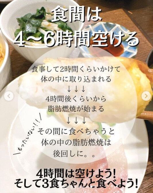 食間は、4~6時間ほどあけるといいのだそう。食事をして2時間くらいをかけて体の中に取り込まれ、4時間後くらいから脂肪燃焼が始まるのだそう。その間に食べてしまうと、体の中の脂肪燃焼はあとまわしになってしまうのだとか。hana.fula_dietさんは、食事の時間は4時間あけて、3食をしっかりと食べることを心がけています。