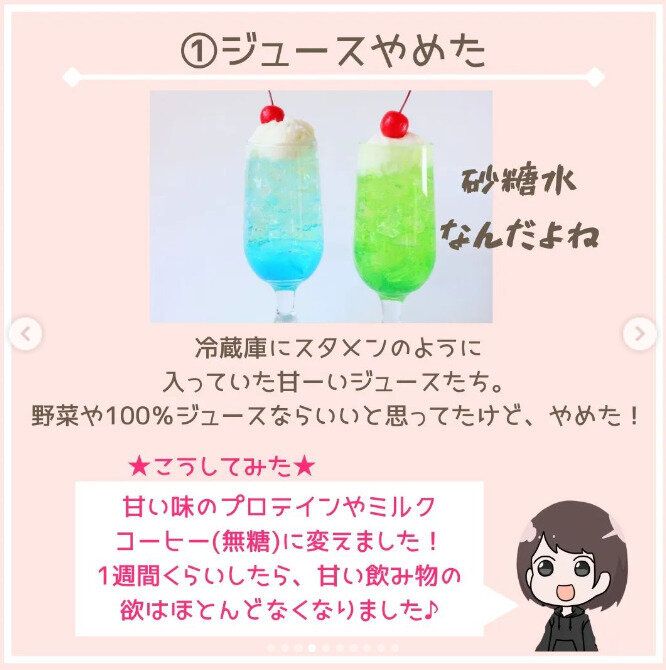 冷蔵庫に必ず入っていたという甘いジュースを飲むことが、以前は習慣になっていました。一気にやめるのではなく、まずは甘い味のプロテインや、無糖のミルクコーヒーなどに変えることからスタート。1週間くらいすると、甘いものを飲みたい!という欲求がなくなってきたといいます。