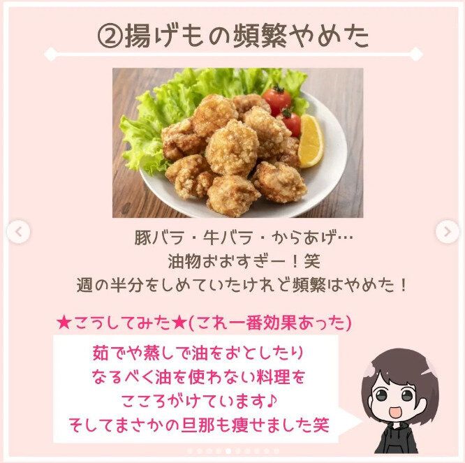豚バラ、牛バラ、からあげなどのメニューが週の半分をしめていることに気づいたkurosan_dietさん。大好きな揚げ物の回数は減らしましたが、食べることを我慢しなくてすむ調理法に変えることに。今では、ゆでたり、蒸したり、なるべく油を使わず調理することを心がけています。じつは、kurosan_dietさんにとっては、これがダイエット成功の大きなポイントだったといいます。なんと、家族も痩せたのだそうですよ!