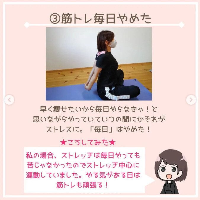 「早く痩せたいから毎日やらなきゃ」と、自宅での筋トレを毎日がんばっていたそう。でも、いつの間にかそれはkurosan_dietさんにとってストレスに。そこで、毎日やっても苦痛ではなかったストレッチだけは続けて、ストレスになっていた筋トレは、「やる気がある日」だけと決めました。