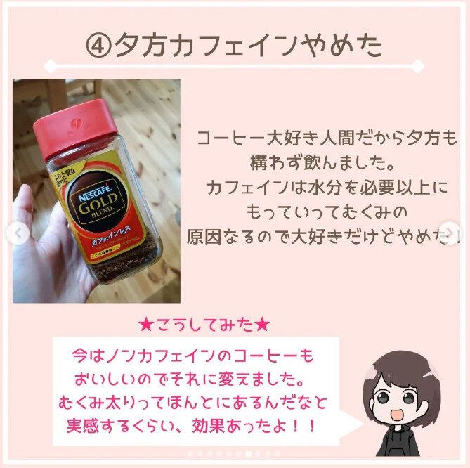 コーヒーが大好きで、夕方以降も飲んでいたそう。でも、カフェインの摂りすぎはむくみの原因にもつながると知って、ノンカフェインコーヒーに変えました。市販のおいしいノンカフェインコーヒーも見つけて大満足。むくみ太りがなくなったことも実感しているそう。