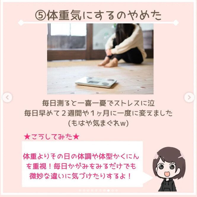 毎日、体重を測っていましたが、少しの増減で一喜一憂してしまい、ストレスになるのでやめました。今は2週間や1カ月など、気が向いたときだけ。体重を気にすることよりも、その日の自分の体調や、鏡に写る自分の姿の変化をチェックすることを重視しています。