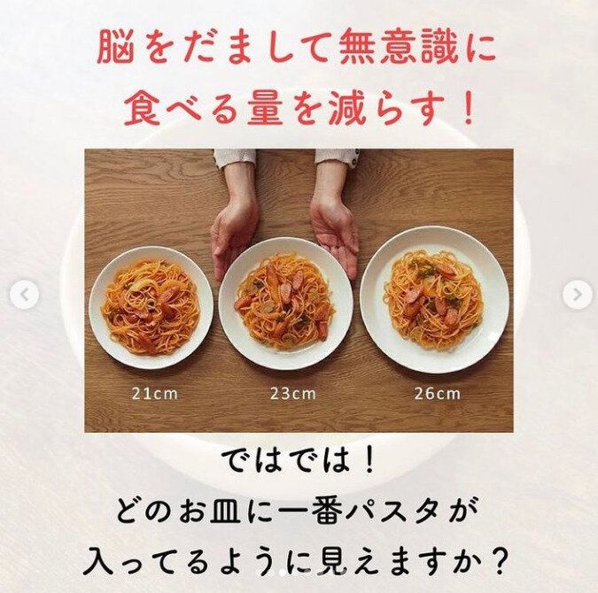 写真の3枚のお皿に入ったパスタをみてください。どのお皿に1番パスタが入っているようにみえるでしょうか?左のお皿が多く見えませんか?そして右のお皿は、なんだか物足りなく感じませんか?
