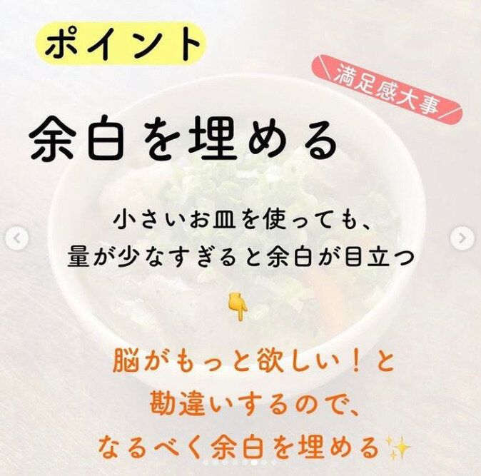 この脳の錯覚を、ごはんの盛りつけにうまく使えばいいのです。普段よりも少なめの量にして、小さいお皿に盛りつけてみましょう。でも、脳は「こんなにある~」と勘違いして、満足感を得やすくなるといいます。ポイントは、お皿の余白をうめること。つい食べすぎてしまうという人にはもってこいの方法です。