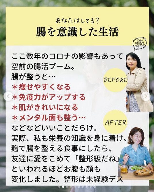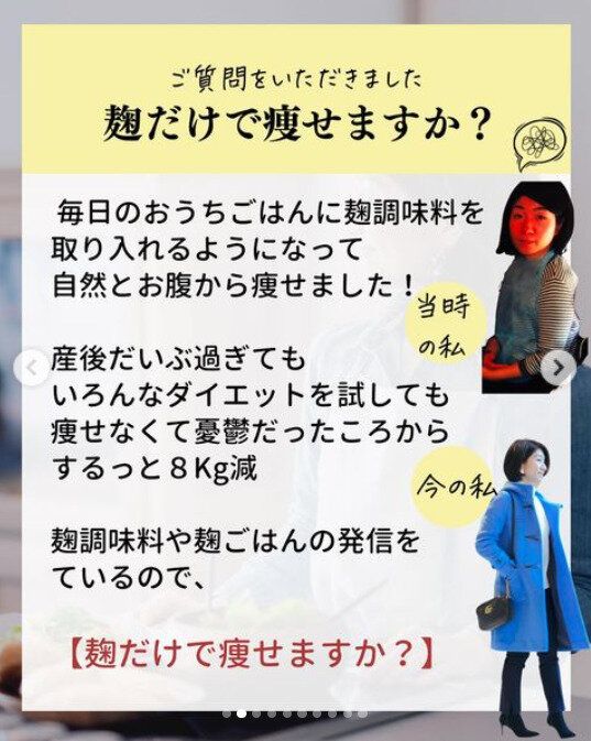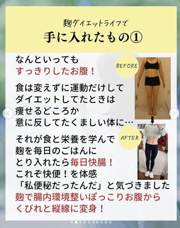 若いころからダイエットに失敗してきた経験で、食生活の大切さにきづき、栄養の知識を身につけたnozomi_koji_onakabijinさん。調味料のこうじをつかった食生活を続けたことで、体重はスルスルと落ち、肌もきれい、メンタル面も整う、といいことばかりだったそう。その変化にお友達からは「整形級だね」という賛辞までもらったそうですよ!