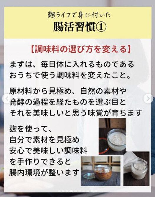 毎日のごはんにこうじ調味料を取り入れたことで自然とお腹から痩せていったというnozomi_koji_onakabijinさん。SNSでも、さまざまなこうじのつくりかたや、レシピを発信しているので、「こうじだけで痩せるのですか?」と聞かれることも多いそう。もちろんこうじだけを食べれば痩せるというものではなく、食生活のなかで取り入れることで自然と「腸を整える習慣」が身につき、ダイエットにつながるなど体の変化を感じるのだといいます。「腸を整える習慣」について具体的に教えてもらいましょう。