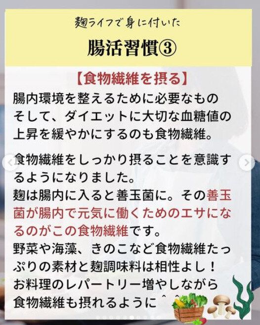 こうじは腸内に入ると善玉菌に。その善玉菌が腸内で元気に働くためのエサになるのが食物繊維です。それを知ってからいっそう食物繊維を意識的にとるようになったのだそう。野菜や海藻、きのこなどはこうじとも相性ばっちり。