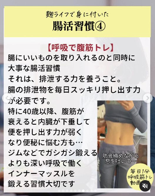 腸によいものを取り入れるのと同時に、腸の排せつ物を毎日スッキリと押し出す力も必要です。とくに40代は腹筋が衰えることで便を押し出す力が弱くなり、便秘に悩む人も増えるのだそう。まずは、深い呼吸を心がけてインナーマッスルを鍛える習慣を身につけることができました。