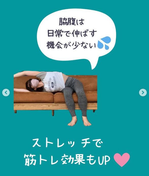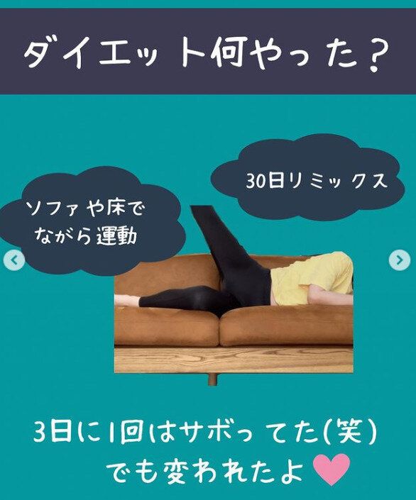 そこでボディメイクをスタート!ご自身いわく、「ぐうたらな性格なので、がんばりすぎると挫折する」と自己分析。あくまでもゆるく、写真のようにソファで寝転んだままできる運動などを取り入れてみました。
