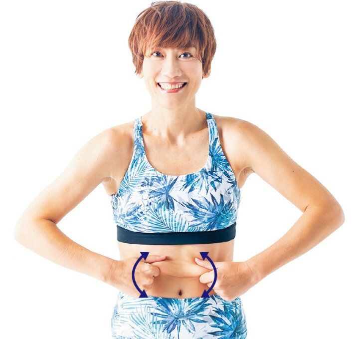 両手でお肉を集めてつまみ、上下にゆらす。筋膜を引きはがすイメージで、深くつまむのがポイント。わき腹や下っ腹など場所を変えて。