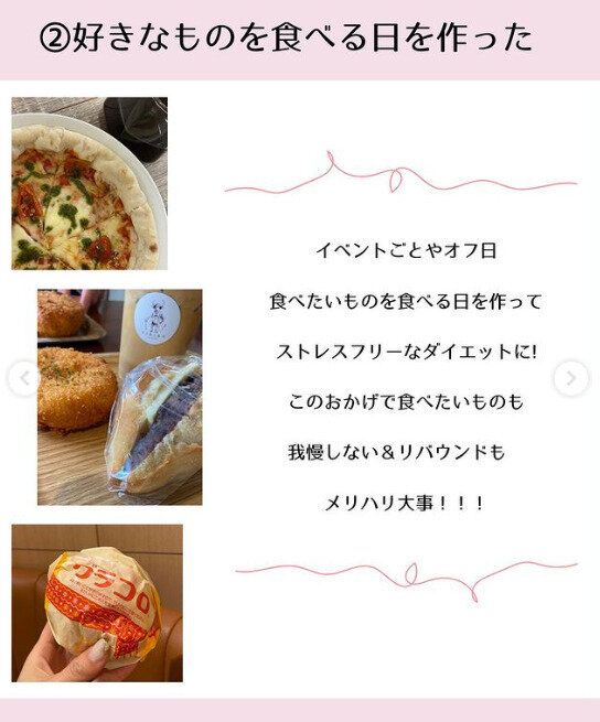 普段は、栄養バランスを考えた食生活を心がけていますが、「ダイエットにはメリハリが大事」と、ときには食べたいものを食べる日をつくって楽しんでいるのだそう。我慢ばかりの食事制限のときにおこっていた、ストレスによる食べすぎを防ぐこともできます。