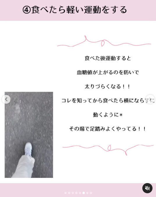 「食べたあとに運動をすると、血糖値があがるのを防いで太りづらくなる」のだそうで、yun_0or100さんは、食べたあとは、軽く動くことを心がけています。「その場で足踏み」をよく行っているそうですよ。