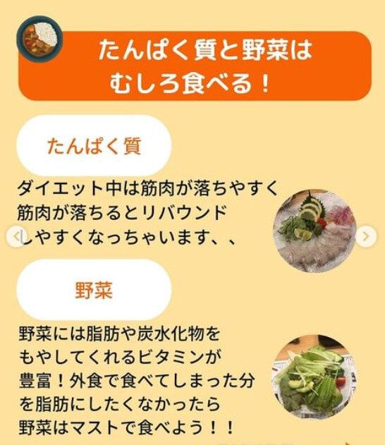 ダイエット中は、栄養バランスのよい食事をきちんととることが基本。外食のときも、タンパク質と野菜を意識して食べてみましょうとchiba_toreさんはいいます。タンパク質をとることで筋肉をつけ、ビタミン豊富な野菜をたっぷり食べて、とりすぎた炭水化物を燃やしていきましょう。