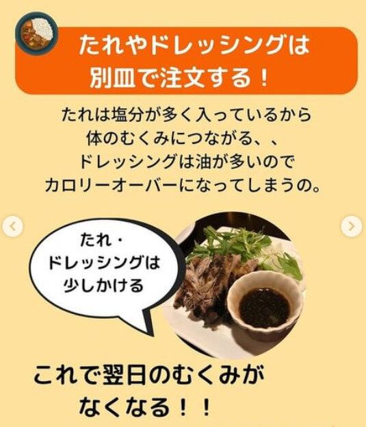 塩分を多く含むたれは、体のむくみにつながります。また、油の多いドレッシングはカロリーオーバーの原因に。注文のときに、別皿でもってきてもらうことをお願いしてみてもいいかも!たれやドレッシングは少しの量だけかけて食べるという意識を。これで翌日のむくみをおさえることができるといいます。