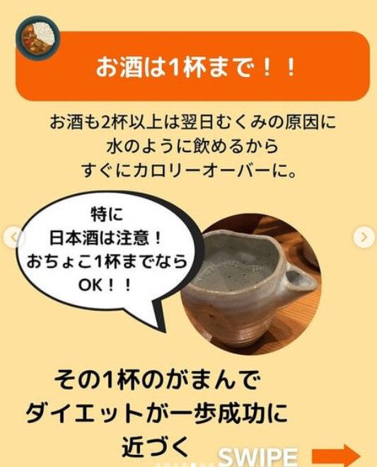 お酒も2杯以上は、次の日のむくみにつながり、カロリーオーバーの原因にも。「その1杯の我慢でダイエットが1歩成功に近づきます」と、chiba_toreさんはいいます。