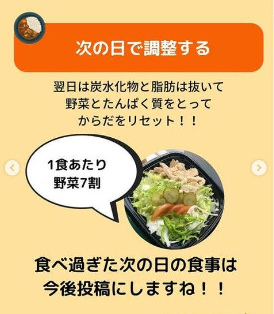 前の夜に炭水化物を食べすぎてしまったら、chiba_toreさんいわく、翌日は炭水化物と脂肪をふくむ食事はひかえめに。たっぷりの野菜とタンパク質をとることで、体はリセットすることができるのです。