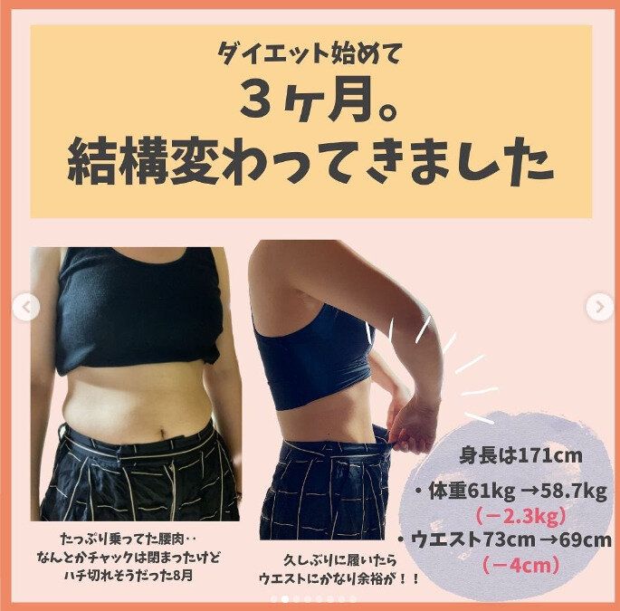 こちらの写真はスタートから3カ月のビフォーアフターの写真。ウエストまわりのお肉はどこへ!?この大きな変化に驚きですよね。成功のポイントは、「食事を意識すると、体の変化は早くなる」ということ。
