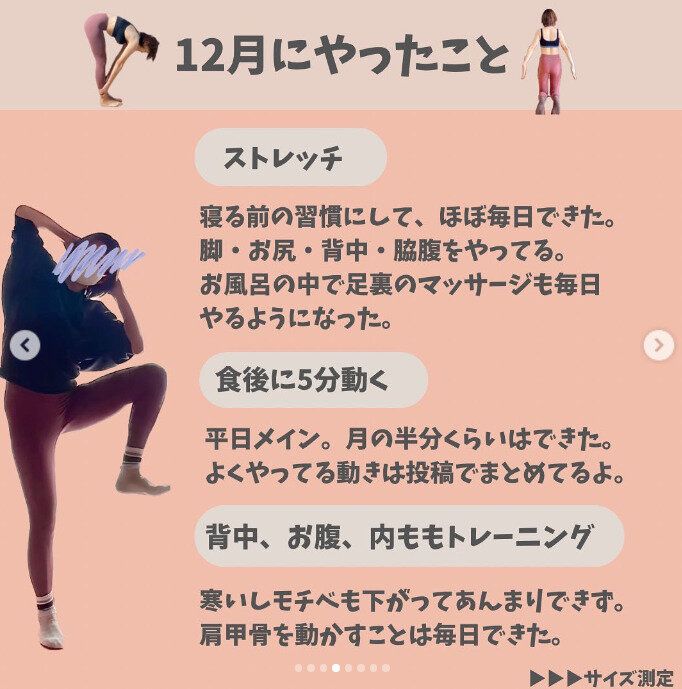 こちらは、「12月にやったこと」を投稿した内容。ストレッチは、寝る前の習慣にしてほぼ毎日行うことができたといいます。また月の半分は、食後に5分ほど体を動かすことも継続していました。12月はトレーニングがあまりできなかったそうですが、肩甲骨を動かすということは毎日できたのだそう。このように、自分ができたことをきちんと書き出すことで、大きな自信にもつながりますよね。これこそが継続していくための大きなポイントになっているのです。